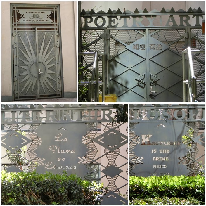 突然發現:這一場串欄杆是和鐵門是特意設計的,每一個單元都不一樣,選材是世界各國對閱讀的名言,譬如:筆是語言(西班牙文)、閱讀是最首要的需要(英文)、開卷有益(中文)等,總共有十幾組。欄杆有巧思,客製而非量產,令人感動!設計者是Ries Niemi,1993年完成。從步上台階從不寬的拱門進入一樓大廳,大廳不高,一抬頭就給天花板的彩繪鎮住了!作者Renee Petropoulos。年輕的藝術家,色彩顯明的拼貼組合,以太陽為中心和建築方尖碑的太陽呼應,給來客注入熱情洋溢的感覺。